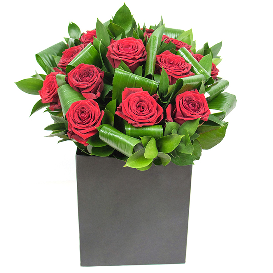Elevate your space with our chic bouquet featuring fiery red roses artfully combined with aspidistra leaves and ruscus. The design is modern yet timeless, making it a perfect gift for any occasion.